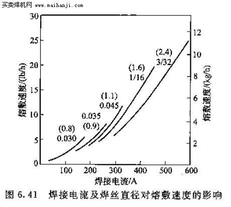 通過選擇不同的焊接工藝參數(shù),每種熔化極氣體保護焊方法均可在很寬的范圍內(nèi)改變?nèi)鄯笏俣?。圖6.4示出了焊接電流和焊絲直徑對低碳鋼焊絲熔敷速度的影響。對于有色金屬,熔敷速度與焊接電流和焊絲直徑的關(guān)系有所不同,這是由電阻率和密度的不同引起的。