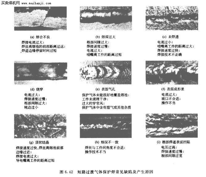 實際焊接過程中,導致焊縫質(zhì)量下降的常見原因有;①破壞氣體保護效果的因素,例如側(cè)向風,如果焊接工作區(qū)有側(cè)向風,則保護氣體被 吹走,空氣進入電弧及熔池,焊縫質(zhì)量會顯著降低。焊接過程中,有經(jīng)驗的焊工是能夠觀察到這種保護不良現(xiàn)象的。保護不良時,熔池表面看上去變臟,且電弧不穩(wěn)定。②保護氣體不純,例如保護氣體中含有水蒸氣、油或其他雜質(zhì)等。③焊絲表面有油污、水分或其他雜質(zhì)。④工件表面有油污、水分或其他雜質(zhì),圖6.42示出了熔化極氣體保護焊常見焊縫缺陷及原因。